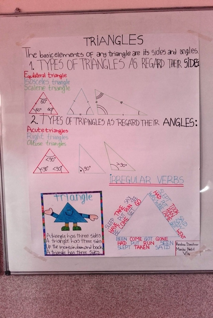 Иако су ученици учили (и користили) неправилне глаголе на часу енглеског језика, научили су и нове речи везане за појам троугла, поделу по угловима (оштроугли, правоугли, тупоугли) и поделу по страницама (једнакостранични, једнакокраки и неједнакостранични) на енглеском језику.