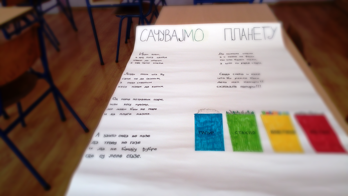 Ученици су подељени у групе. Групе су организовали сами ученици уз мање сугестије предметног наставника. Услов је био да групе буду мешовите. Свака група је добила задатак да напише песму у којој ће употребити неке од следећих мотива: планета, брига за планету, рециклажа, боје, екологија, природни ресурси, смеће, очување планете и слично. Број строфа у песми је требало да одговара броју чланова групе. Такоће, било је неопходно да се песма илуструје одговарајућим паноoм или дигитално, зависно од афинитета групе. Једна група се определила за дигиталну презентацију, друге за паное. Групе су радове презентовале 13, 14, 15 и 16. маја. Приликом представљања сваки члан групе је био ангажован. Евалуација пројекта урађена је 17. маја.