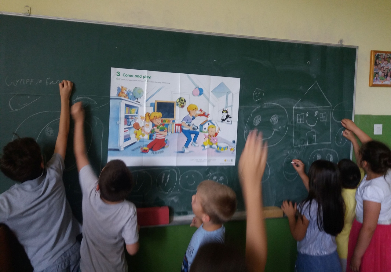 У току часа смењивале су се следеће активности: разговор о илустрацијама и постерима (кроз које смо утврђивали уведене појмове, као и описивање на основу боје и броја), певање песмица уз кореографије и играње игара (кроз које смо наставили утврђивање појмова и боја, али смо се и размрдали, па је тако остварена и корелација са предметима Физичко васпитање и Музичка култура).