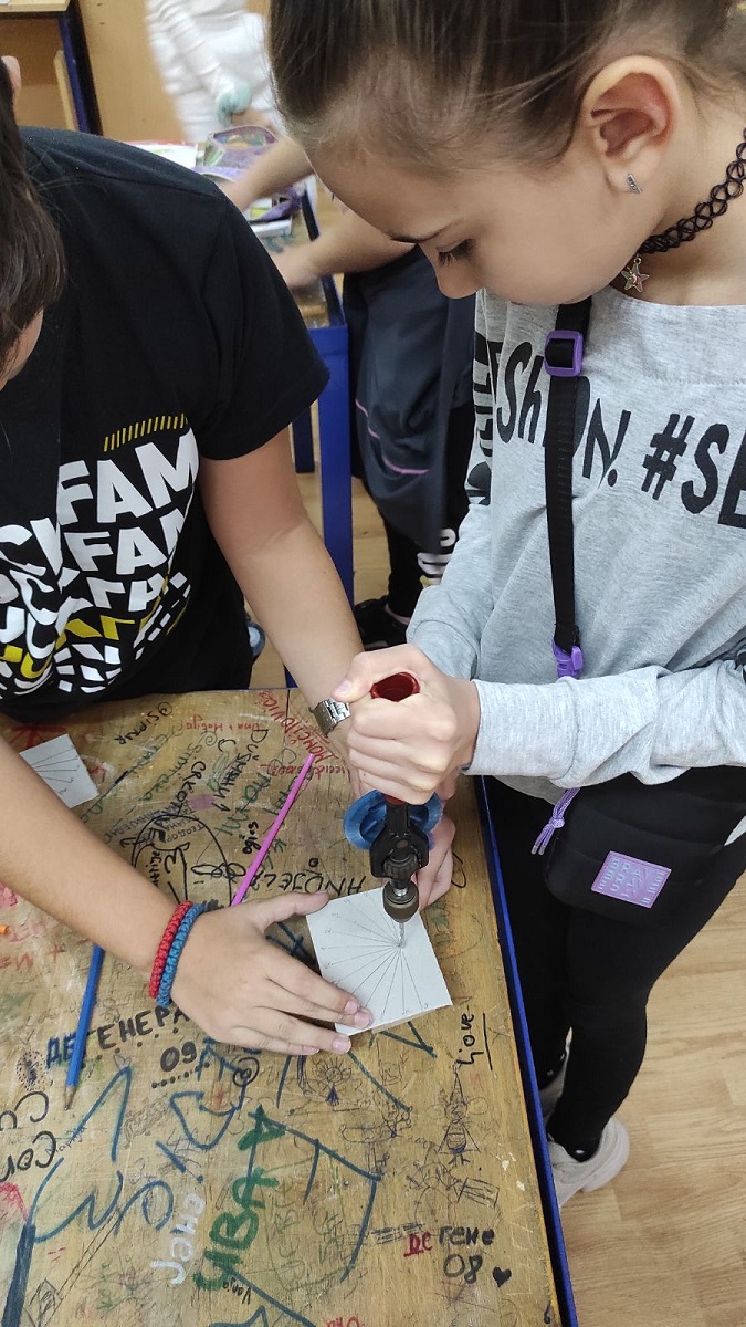 Наставница је упутила ученике у пројекат „Израда сунчевог сата“ који се састојао из више радних операција - преношење мера на картон, исецање картона, обележавање одговарајућих степени помоћу угломера и оловке, обележавање сатница, бушење рупе и провлачење сламчице кроз картон.