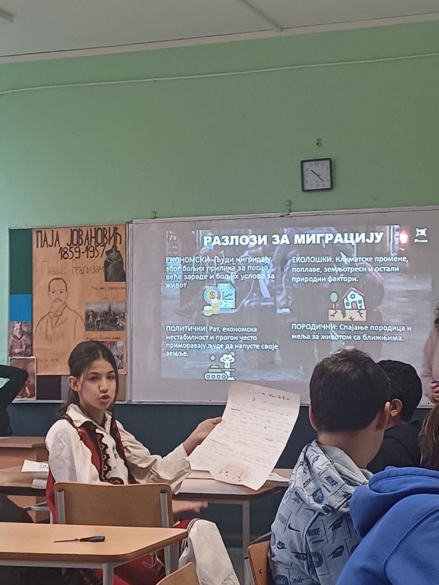 Час је успешно спроведен, а ученици су показали изузетну заинтересованост и тимску сарадњу. Ово је био пример креативног и иновативног приступа настави, где су ученици сами истраживали и анализирали важну глобалну тему. Миграције становништва су одраз глобалних социјалних и политичких процеса, а овакви часови помажу ученицима да развију критичко размишљање и дубље разумеју светске токове.